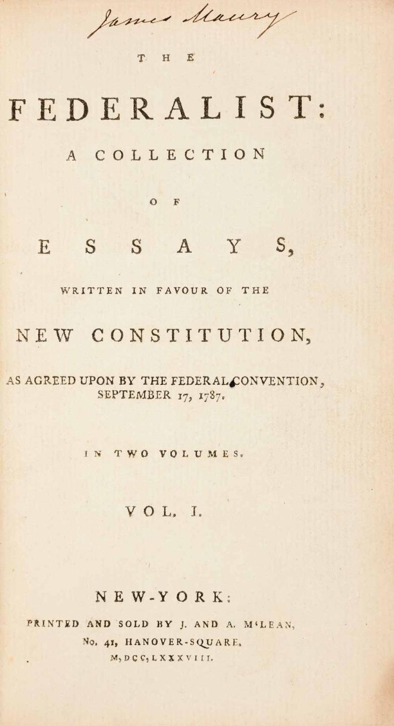Because of the authors’ anonymity, there are no true presentation copies of the first edition of The Federalist. But, as one of only two copies known to have ever been personally gifted by one of the authors, this is the closest one can come to such a treasure, as the other copy, gifted by Hamilton, is owned by the Pennsylvania Historical Society and is housed at the Library Company of Philadelphia. Maury’s copy, estimated at more than $250,000, is the only near-presentation copy ever to be offered at auction.