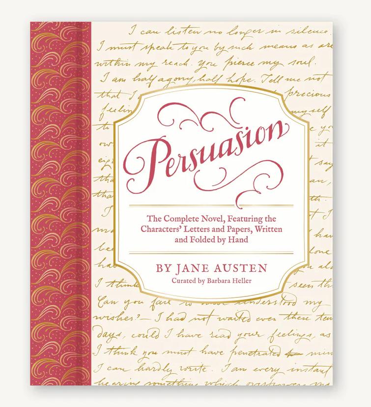 BH: Yes, the first thing I do is I research letters from the time to find handwriting that I think matches the character. Then find actual examples of letters that I feel could have been written by Captain Wentworth, or Mary Elliot Musgrove, or Mr. Collins, so that I have something to show a calligrapher so they can see what it is that I'm after. And then I work back and forth with the calligrapher. We just do tons of samples, looking at the ink color and the size of the writing, and is it pointy, is it angular? What is it about the sample that captures the essence of that character? Why is that particular handwriting right for Captain Wentworth? And then also, what kind of paper are they going to write on? Laid paper or rag paper, and the size, of course, is really important, too. And the color! The calligraphers do a million versions till we hit upon the one. I think we both feel it when it nails the handwriting and the emotion and the way it looks on the page.