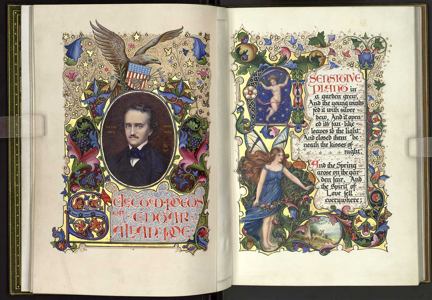 Two more of the Ransom’s S&S manuscripts, Oliver Goldsmith’s The Hermit and James Russell Lowell’s The Vision of Sir Launfal, are handwritten in calligraphy on parchment by Alberto Sangorski (Francis’ older brother) with decorative borders and illuminated miniatures. Around 1905, Alberto had begun to produce illuminated manuscripts on vellum. These had elegant calligraphy, illuminated initials, and watercolor miniature paintings—all his own work. The early manuscripts were done for S&S, but in 1910, Alberto fell out with his brother and went to work for Riviere.