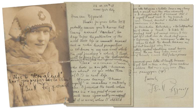 The letter is paired with a signed by F. Scott Fitzgerald: a matte-finish photo of Zelda Sayre Fitzgerald, boldly signed in fountain pen with reference to This Side of Paradise, "This is 'Rosalind,' don't you prefer her to Clara? F. Scott Fitzgerald".