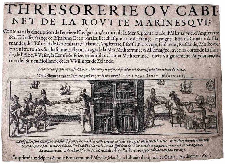 Title page of Lucas Janszoon Waghenaer's Thresoor Der Zeevaert… Amsterdam, Cornelius Claesz., [?1602]. Offered at £80,000.