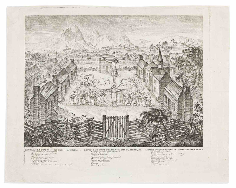 Engraving, circa 1812, a view of the compound built by the Sisters of Loretto, an order of Catholic nuns founded in central Kentucky, one of the first religious communities for women in the United States. Estimate $1,500 to $2,500.