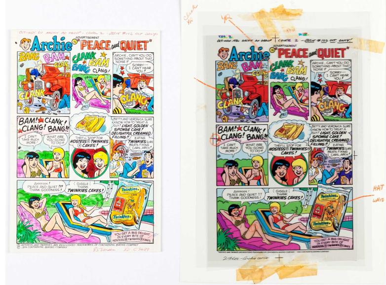 Hand-colored reference guide and CMYK films for a 1980 Hostess Twinkies ad featuring the Archie Comics characters, offered at Heritage Auctions this week.