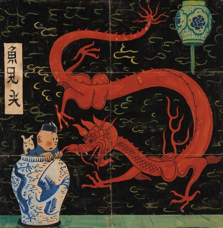 Hergé (Georges Remi). The Blue Lotus (details). India ink, watercolor and gouache on paper for the initial cover of the album The Blue Lotus published in 1936. The publisher had to refuse this cover as it was too expensive to print at the time. Estimate: €2,000,000 -3,000,000