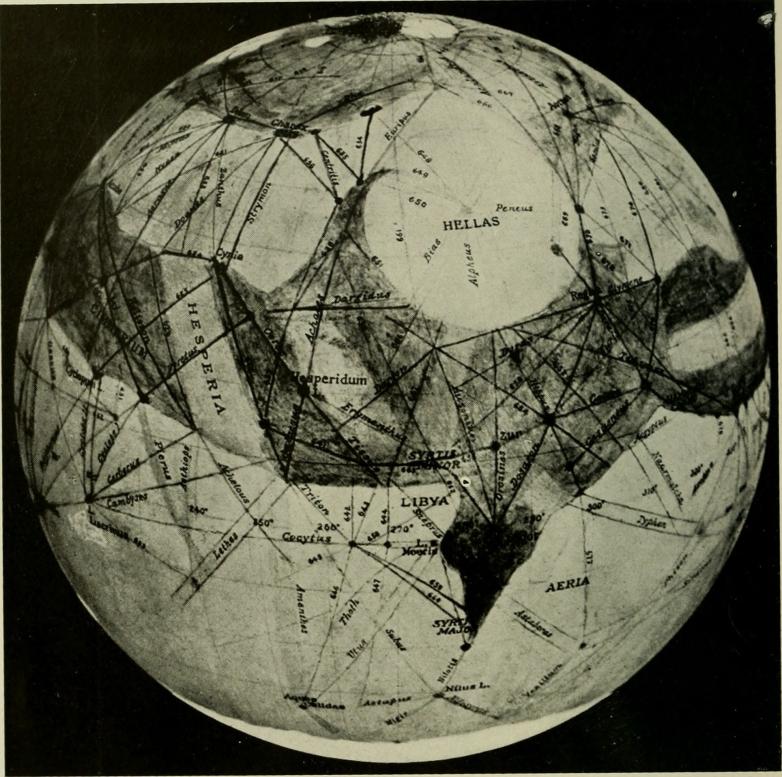 Indeed it seems Brun was a Red Planet admirer, and she had also fallen under the spell of American businessman and pop sci prophet Percival Lowell (1855-1916). Building on the worked of an Italian astronomer, Lowell became convinced that he had discovered an extensive canal system on Mars, which, in turn, proved (to him) the existence of an ancient Martian civilization. Lowell spent many years at his observatory in Flagstaff, Arizona, drawing the wrong conclusions about what he was seeing through the telescope. He published three books on the subject: Mars (1895), Mars and its Canals (1906), and Mars as the Abode of Life (1908). Powell’s discredited cartography fueled mid-twentieth-century science fiction novels like Heinlein’s Red Planet and Bradbury’s Martian Chronicles.
