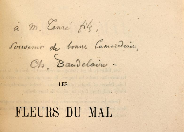 A first edition signed by the author of Charles Baudelaire’s Les Fleurs du Mal (1857), from which six poems had been banned, will be offered by Rare Books Le Feu Follet.