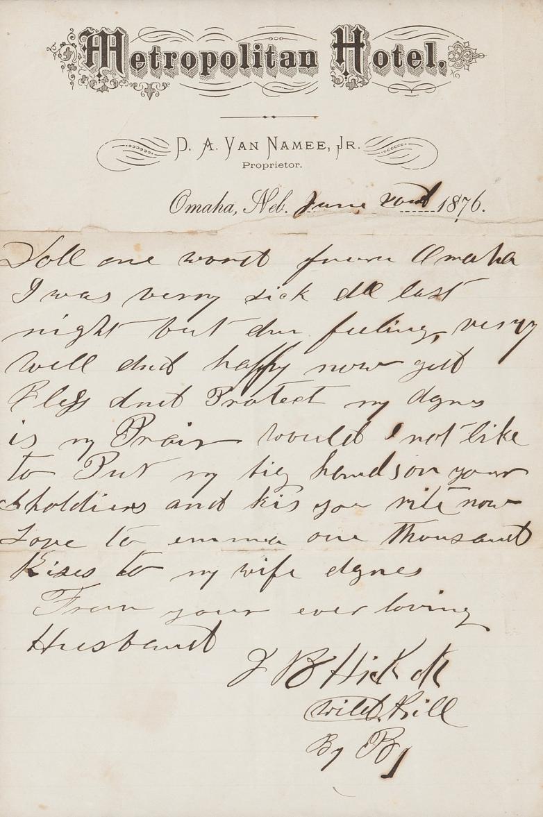A letter by "Wild Bill" Hickok, written in June 1876 to his wife, Agnes, sold for $100,000.