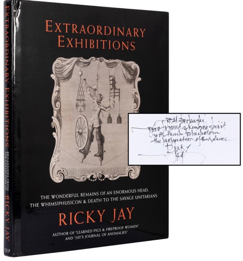 A presentation copy of Ricky Jay's Extraordinary Exhibitions, is estimated at $400-600.