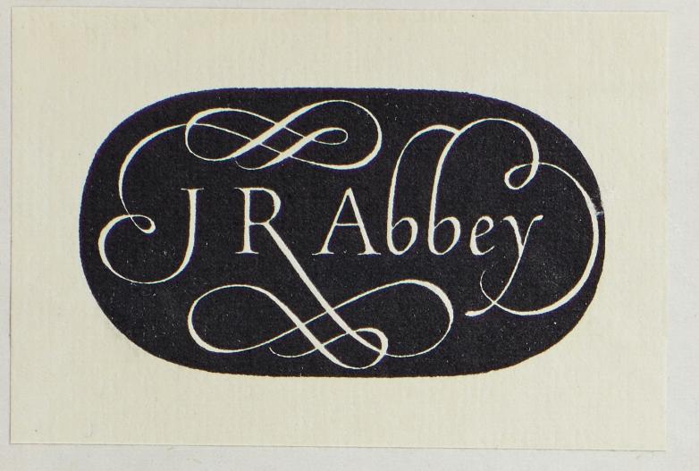 Highlights of his collection included his many color plate books (which he sold to philanthropist Paul Mellon and are now in the Yale Center for British Art) and book bindings, many of which he personally commissioned. This exhibition features pictures of many of these that are now held at arguably Britain’s most impressive private library, Sir Paul Getty’s Wormsley Library in Buckinghamshire, as well as a beautiful bound copy of a history of Sussex bought by Abbey in 1941. Also on display are books owned by Abbey that feature his calligraphic book label. Abbey had various different sizes and colors of bookplate and kept many books in colorful tailor-made boxes, often by Winstanley of Salisbury.