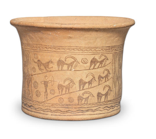 Until then, let’s have a look at some of his animal-themed antiquities. The one pictured above is a large Persian pottery jar dated circa late 3rd to late 2nd century BC, and shows a hunter with a bow and arrow holding a curly-tailed dog which, in turn, is herding goats on a mountainside. It is, according to Bonhams, one of the first known depictions of a dog on a lead. The estimate is £20,000-30,000 ($25,000-38,000).