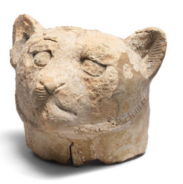 Lot 43 (pictured) is an Egyptian terracotta lion head, dating to c. 323-30 BC. Its large eyes and whiskers define this piece; a closer look will reveal traces of pale green glaze. The estimate is £800-1,200 ($1,000-1,500).