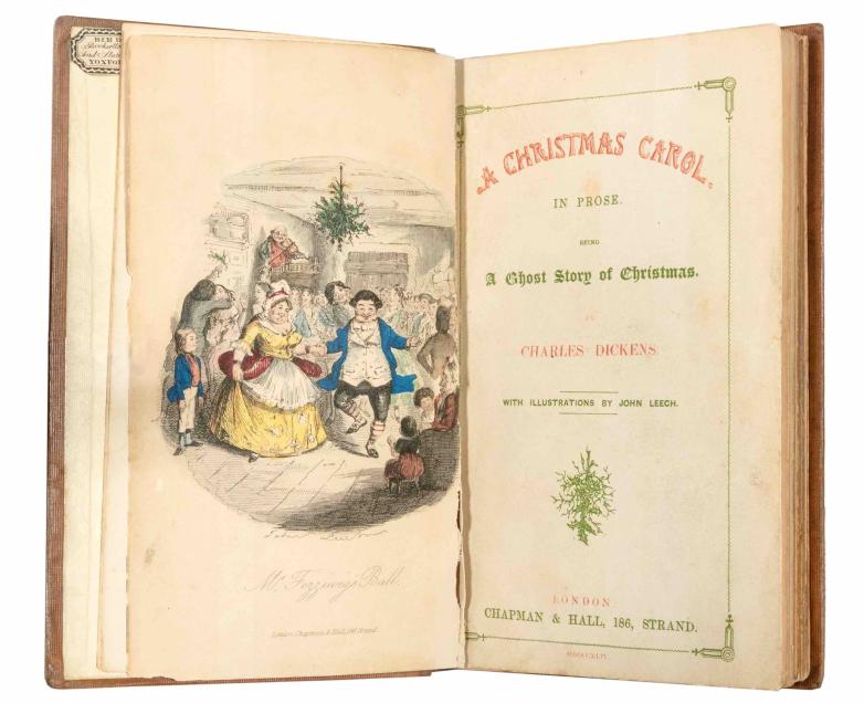 An extra yuletide treat on show is the world’s first printed Christmas card and its proof copy from 1843, and—apropos to Fine Books readers—various copies of classic titles such as Pride and Prejudice in 1890s editions magnificently bound specially to be given as gifts to the wives of workers at antiquarian booksellers Maggs Bros.