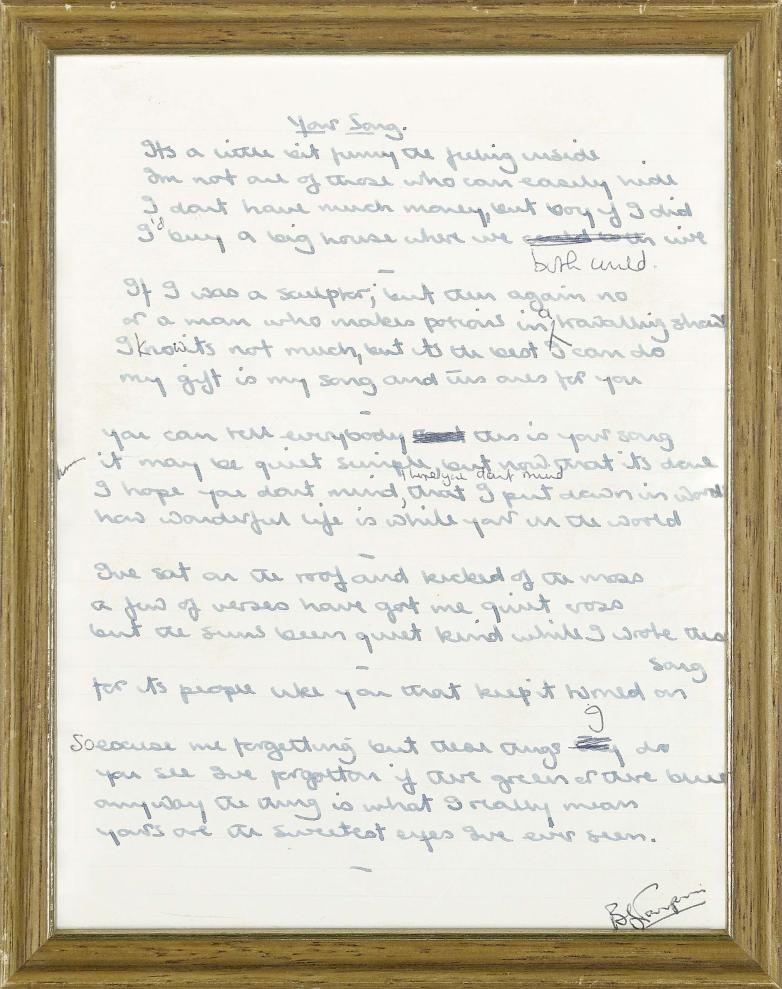 The Original Handwritten Lyrics to Elton John's "Your Song" by Bernie Taupin. Price Realized: $237,575