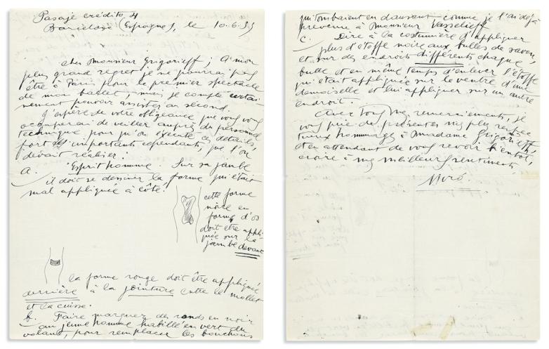 Additional autograph highlights include: Thomas Edison, explaining in a 1922 typed letter signed that he and his assistants worked five days and nights without sleep so that the first phonograph would be ready to be unveiled at the Exposition Universelle in Paris ($3,500-5,000). The master of musical theater Stephen Sondheim celebrates the successful opening weeks of A Funny Thing Happened on the Way to the Forum in a 1962 TLS, in which he also jokes that the title “ex-queen of television” might apply equally to Leonard Bernstein or his wife ($800-1,200). Among the writers in the sale is an extraordinary three-page ALS from the expatriate Thomas Mann, writing to his two eldest children in 1938 about their recent book on the culture of exiles, acknowledging that “German freedom and the Weimar republic have been destroyed; we, you and I, are not altogether guiltless in that matter” ($10,000-20,000). Joan Miró is on offer, with the ALS he wrote to Ballets Russes director Serge Grigoriev in 1933, in which Miró describes some changes to be made to the costumes he designed for the ballet Jeux d’enfants, illustrated with two small sketches ($3,000-4,000). In addition to these, excellent examples of letters, documents, photographs and other items, signed by U.S. presidents, astronauts, suffragists, labor leaders, and more.