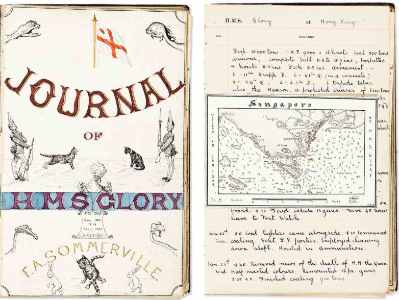 * F.A. Somerville, Journal of H.M.S. Glory from November 1900 to April 1902, with 68 pen-and-ink and watercolor maps, track charts, and illustrations of the ship’s mechanical devices, each monogrammed by Somerville and initialed by commanding officers. Estimate $4,000 - $6,000.