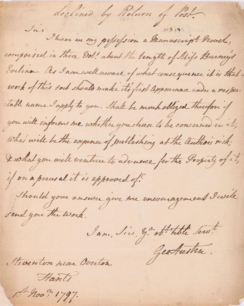 Among the letters on display is one from Jane Austen’s father George Austen, a former student and tutor at St John’s. His 1797 letter offers the novel which would become Pride and Prejudice for publication to the bookseller Thomas Cadell, asking if Cadell would “choose to be concerned in it; what will be the expense of publishing at the Author’s risk”. A note at the top of the letter indicates Cadell said no.