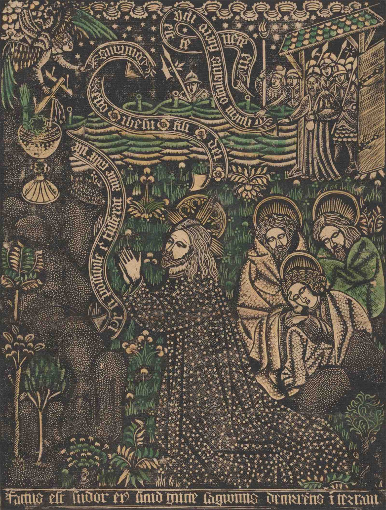 Christ on the Mount of Olives. Metal-cut relief print, hand-colored. Germany, ca. 1455–1465.