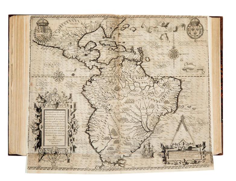 • The Great Voyages - America. Printed in Frankfurt 1590-1592 by Theodor de Bry. The first Latin edition of the first three part of The Great Voyages by the Dutch engraver and publisher best known for his illustrations and maps for books on European expeditions to the Americans, but who famously himself never travelled to the New World. Estimate: US$30,000-50,000.