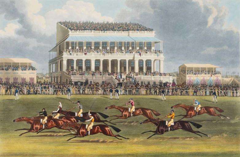 One of six colored aquatints of the Epsom races by James Pollard, offered at Forum Auctions this week.