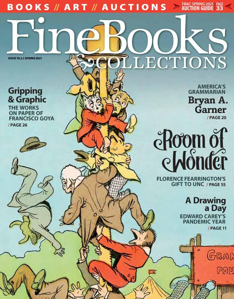 Like you, we’ve made it through this pandemic year by sheltering at home with our books, attending virtual book fairs, and Zooming with colleagues and friends. We’ve also continued to cover the world of collecting both online and in print, and we think you’ll be pleased with our latest production: the spring 2021 issue, featuring a profile of America’s grammarian, Bryan A. Garner, and a look at Francisco Goya’s works on paper, now on exhibit at the Met.