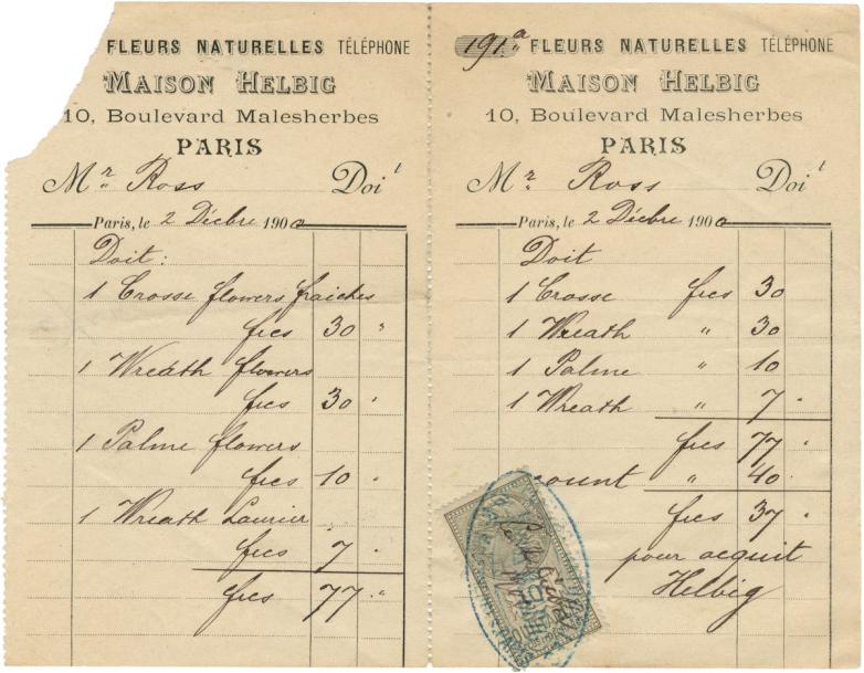 - The bill for flowers at Oscar Wilde’s funeral, made out to Robert Ross, amounting to 77 francs, submitted by Maison Helbig of 10 Boulevard Malesherbes, Paris, 2 December 1900.