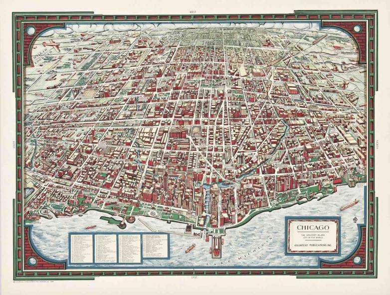 Lot 135: C.L. Hawkins, Chicago the Greatest Inland City in the World, color-lithographed perspective map of Chicago looking west from Lake Michigan, Chicago, 1938. Estimate $800 to $1,200.