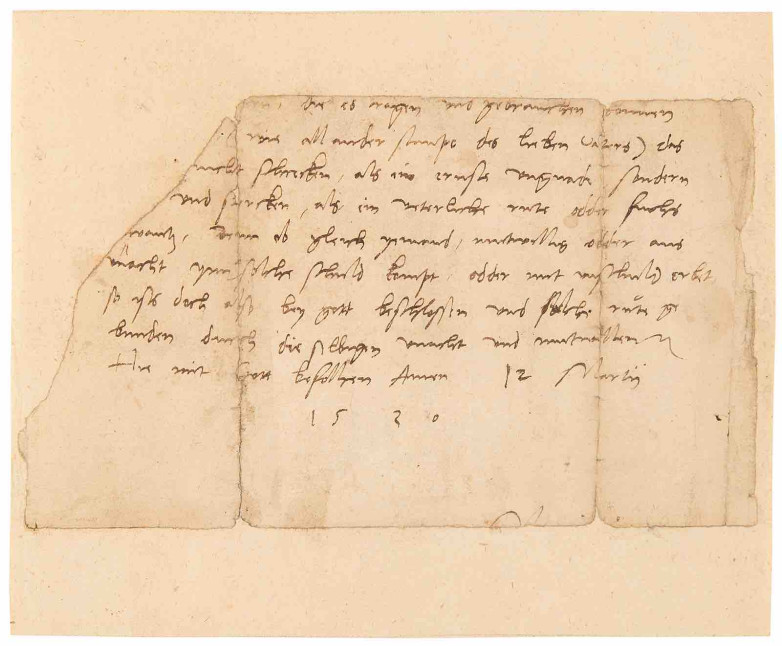 * a signed letter from Martin Luther, dated March 12, 1530, addressed to Joseph Levin Metzsch, Lord of the Castle of Mylau in which Luther tackles the question of whether debt inherited from one’s parents is an act of God's will and punishment. He writes: “Even if someone comes into such guilt willfully or through carelessness, or inherits it with innocence, it is still decreed by God.”
