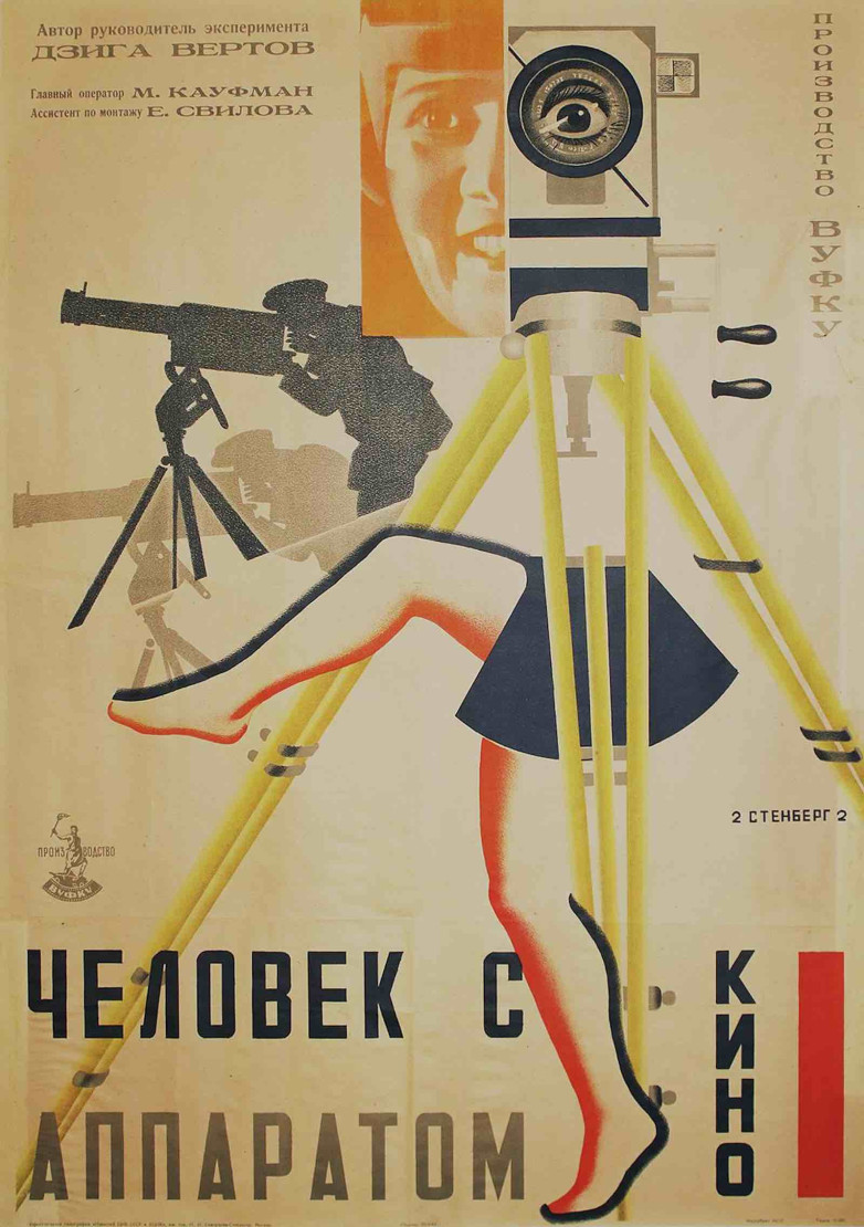 The Stenbergs were avant-garde Russian artists and designers who also produced posters for movies by Sergei Eisenstein, and a good match for the similarly avant-garde film directed by Dziga Vertov with Mikhail Kaufman on the camera, and editing done by Vertov´s wife, Yelizaveta Svilova.