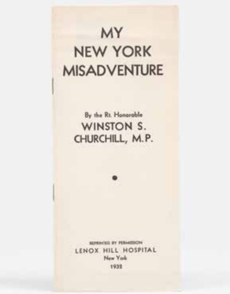 Churchill was in New York earning money on a lecture tour after losing much of his wealth in the 1929 Stock Market Crash. He looked the wrong way on Fifth Avenue and was hit by a car and almost killed. While he recovered, he wrote an account of the experience, and allowed his doctor to print it as a leaflet (New York, reprinted by permission, Lenox Hill Hospital, 1932) to raise funds for the hospital where he was treated. Although it was printed in the Daily Mail newspaper in 1931 as an article and reprinted in the 1976 Collected Essays, this first and only separate eight page edition is the only known surviving copy.