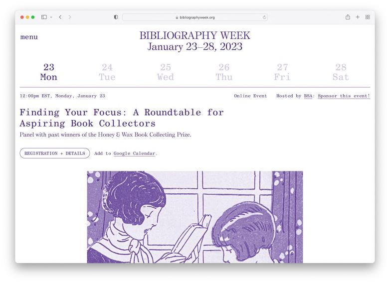 The Bibliographical Society of America (BSA) and the Antiquarian Booksellers' Association of America (ABAA) have announced a new collaborative project, BibliographyWeek.org. This new venture promotes Bibliography Week and aims to make it easier for attendees to plan to attend events, whether in-person or online.
