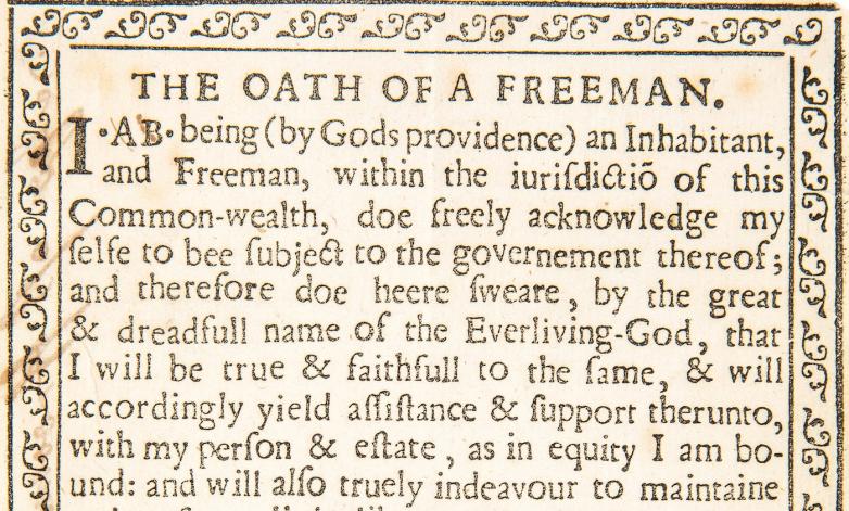 The original “Oath of a Freeman,” printed in 1638 or 1639 by Stephen Daye in Cambridge, Massachusetts, was known only by a second printing a decade later. Hofmann, famed for his forgeries of handwriting, proved he was also adept at printing, and brazen at both.