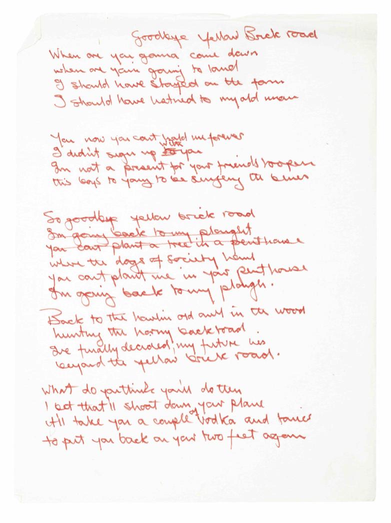 Original handwritten lyrics for Elton John's hit song, "Goodbye, Yellow Brick Road.” Estimate: $150,000-250,000.