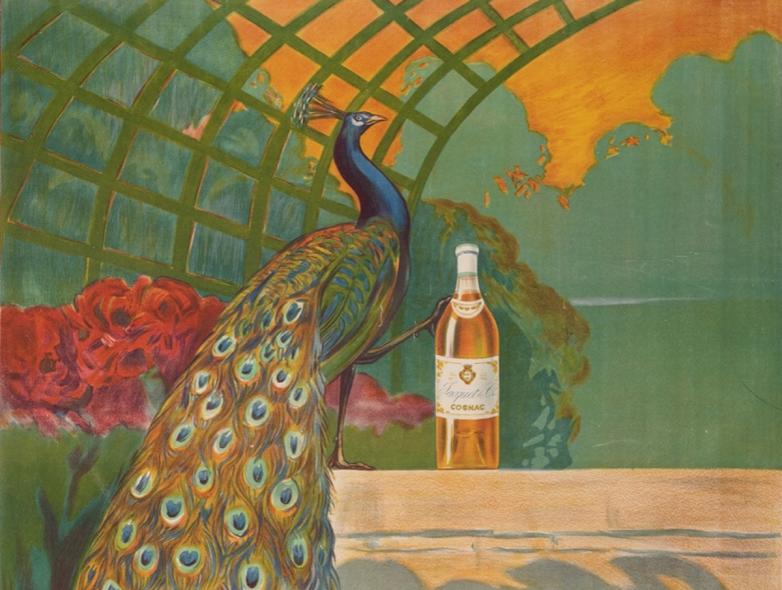 · Lot #561, Camille Bouchet's (1799–1890) Cognac Jacquet, is estimated at $900-1,300. This iconic, linen backed color lithograph poster depicts a colorful peacock and a bottle of cognac. It measures 62-½ x 46-¼” and was printed in the 1920s in Paris by Vercasson.