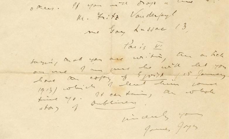 A letter signed by James Joyce to Madame Yasushi Tanaka (Louise Gebhard Cann), is estimated at $10,000-15,000.