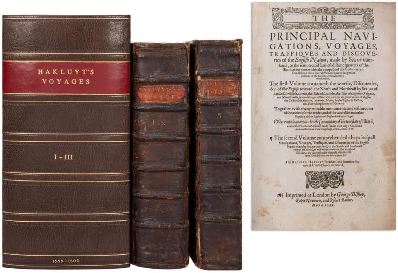 · Lot #46, Richard Hakluyt's (c. 1552–1616) The Principal Navigations, Voyages, Traffiques and Discoveries of the English Nation, made by Sea or over-land, to the remote and farthest distant quarters of the Earth, at any time within the compasse of these 1500 yeeres, almost doubled its low estimate to sell for $48,000. This three volume, second (first enlarged) edition was printed in London in 1599 and had provenance to Charles Maynard, 1st Viscount Maynard and others.