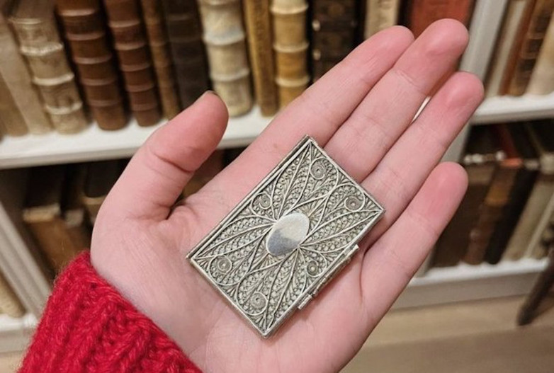 In the runup to Christmas Day, the London-based rare books and manuscripts dealer is putting up on its X/Twitter feed 24 lovely books taken from its upcoming catalogue of bindings. The first, pictured above, is the smallest to feature, a silver filigree binding over blue silk on a miniature London Almanack. Behind today's door is a 19th century prayerbook printed in what is now Czechia in a Bauerneinband or 'peasant binding' which features printed figures of Saints Barbara and Lucy.
