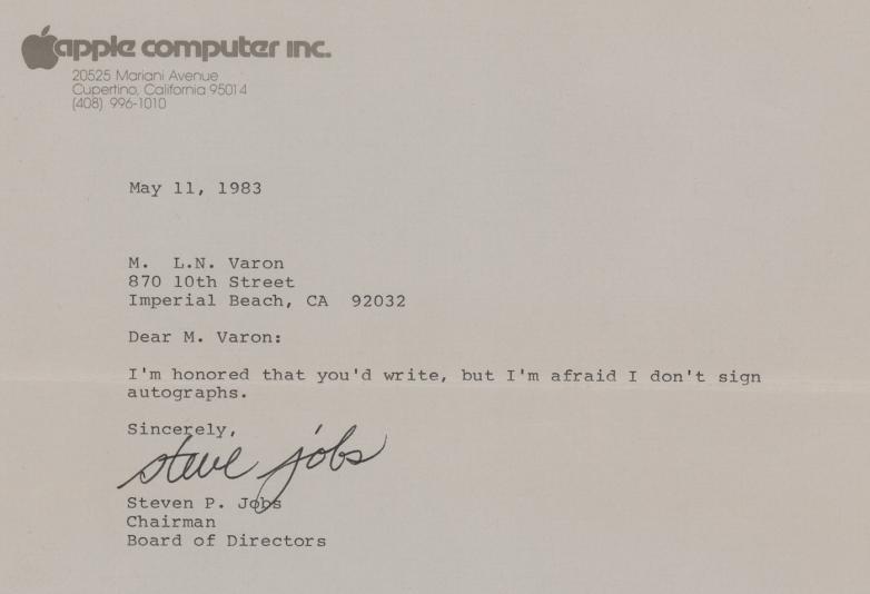 Also on Thursday, Apple and Steve Jobs at RR Auction, in 35 lots. A working Apple-1 computer from the collection of Roger Wagner is expected to lead the sale, estimated at more than $450,000. An amusing May 11, 1983 note from Steve Jobs replying to a request for an autograph by writing "I'm honored that you'd write but I'm afraid I don't sign autographs," and then signing the typed letter, is estimated at more than $10,000 but had been bid up to more than $35,000 as of Sunday afternoon. An Apple Lisa model, also from Roger Wagner's collection, is expected to fetch more than $25,000. The first issue of Macworld magazine, signed on the cover by both Jobs and Wozniak, is estimated at more than $50,000.