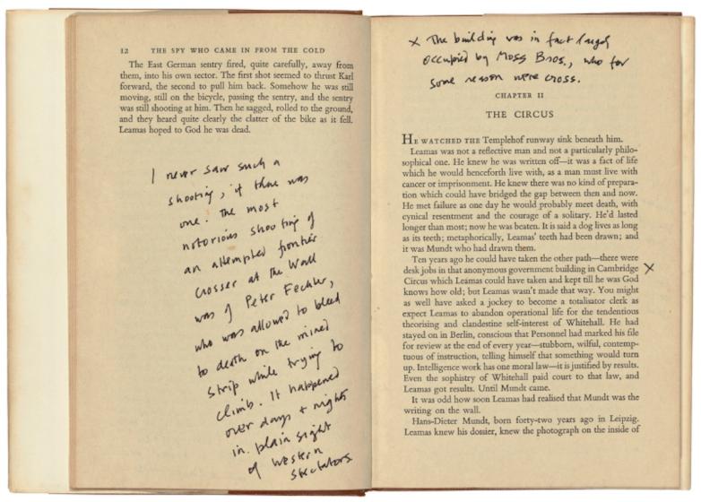 Annotations from John le Carré's The Spy Who Came in from the Cold, offered at Christie's this week in a sale to benefit the charity English PEN.