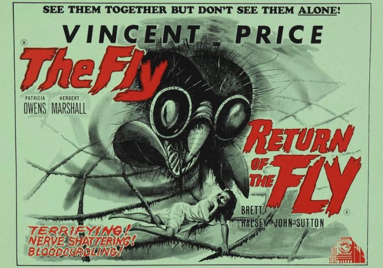 Promotional piece for the Vincent Price films "The Fly" and "Return of the Fly," offered as part of a large archive of British film promotional material at Dominic Winter Auctioneers this week.