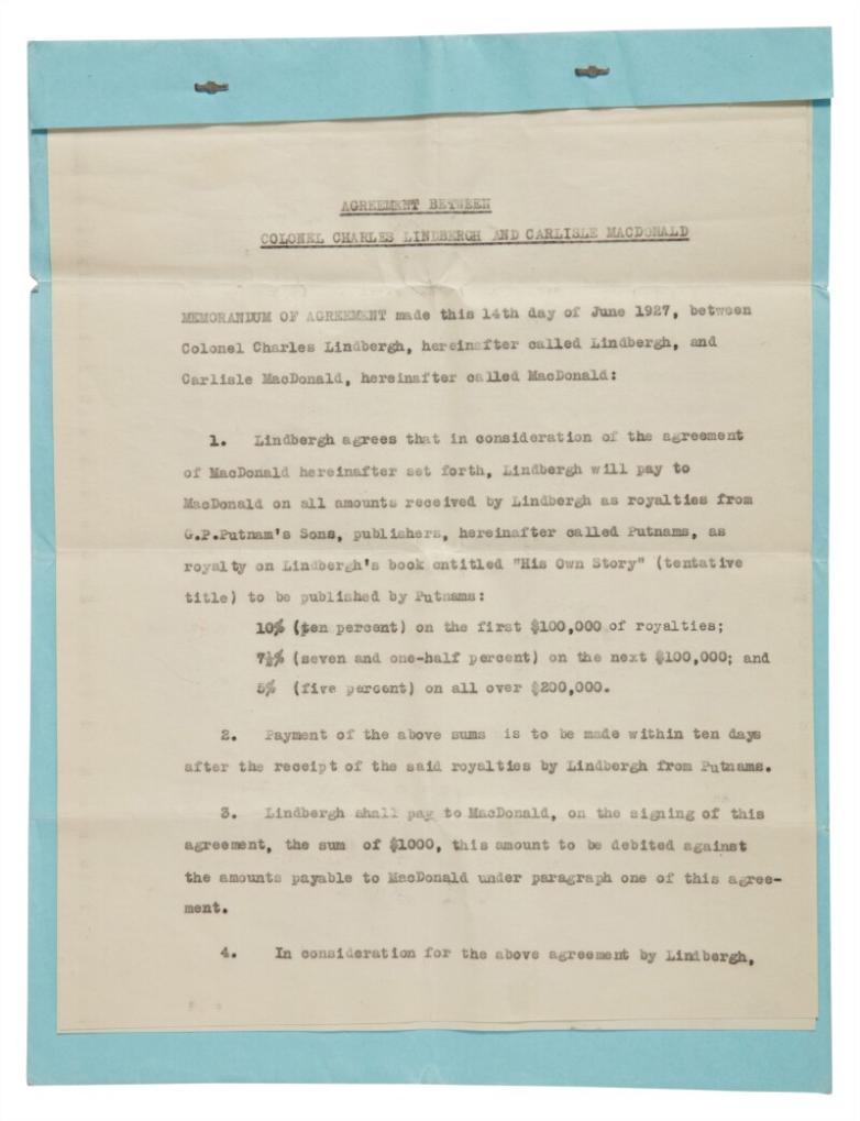 This signed, typescript agreement between Lindbergh and his ghostwriter, J. Carlisle MacDonald, dated June 14, 1927, lays out the royalties the men would split—10% of the first $100,000; 7½% on the next $100,000; and 5% on any amount above $200,000—as well as the advance MacDonald would earn ($1,000), as the two collaborated on the book.
