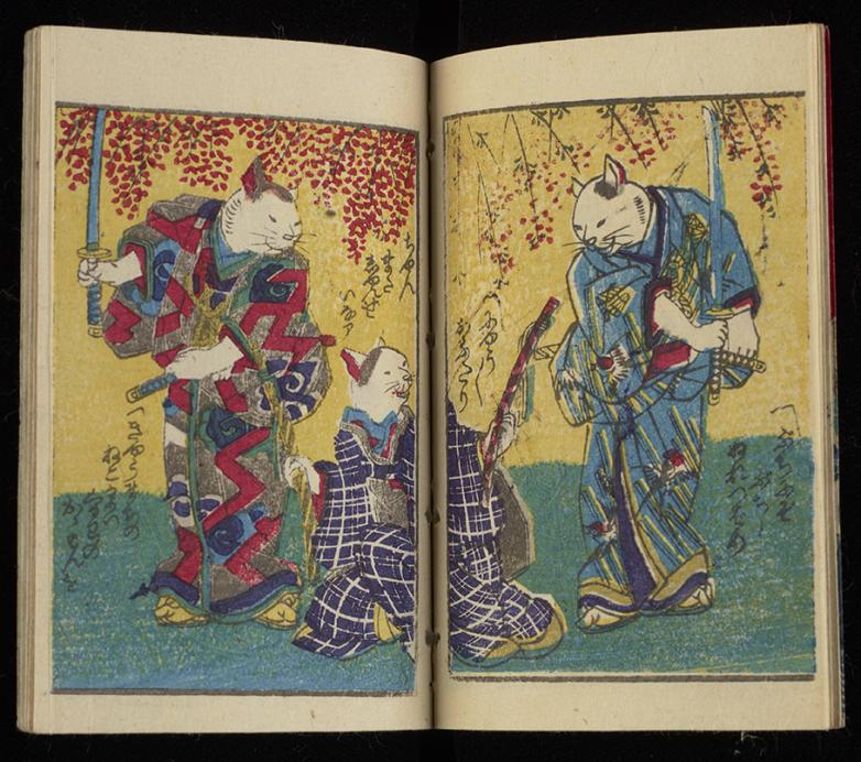 Among highlights is the book Neko no shibai (Cat theatre), woodblock-printed in the late nineteenth century, with full-color illustrations of cats dressed as Edo-period samurai complete with swords. Many of the items are going on display for the first time, including a seven meter-long scroll of the Lotus Sutra, an important Buddhist scripture. It was produced in Japan around 800 years ago with each Chinese character handwritten in pure gold on paper dyed with indigo.