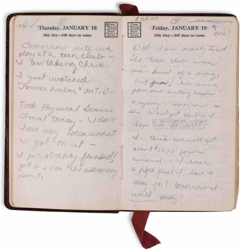 The musician's burgundy personal diary for 1968 with handwritten entries and annotations for 1968, labelled Day Record Year Book from Bauer-Schweitzer Malting Co, Inc. on the cover. Diary entries written in pen and pencil, filled with personal notes, gig dates, illustrations, and other general information, with 24 personal and promotional photos of the band Fitz. Topics covered include Nicks' personal relationships, her decision to change her hair from the classics 1960s flip to the iconic straight style she became known for, vacations, and her parents leaving the Bay Area for her father's jobs while she stayed. Sold for US$76,700 at Bonhams.