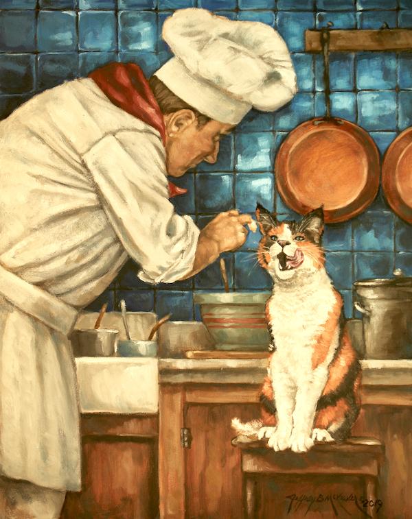 In the story, a famous chef working at a fictional restaurant called The Amiable Fleas is fretting over the impeding visit of a restaurant critic, while relying upon his cat, Apollo, to taste his food and nod an approval or disapproval.