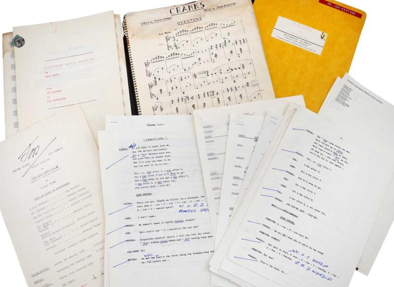 The Navy Lark script, for a show broadcast on October 3, 1965, is signed 'Jon' on the first page and features his marks, annotations and occasional doodles. Also included is a typed sample television script adapted from BBC Radio series Puffney Post Office featuring Jon Pertwee as The Postmaster, n.d. [after 1950], and the script for the play My Dear Gilbert featuring Pertwee as W. S. Gilbert, heavily annotated in blue ballpoint ink and pencil, 1969.