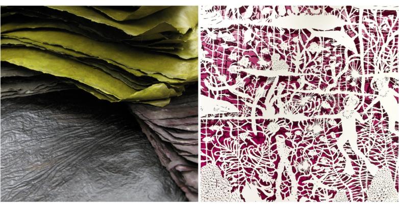 Left: Mary Hark, Editioned handmade papers, each sheet is 18” x 24”, flax and abaca fiber, hand painted pigments.Right: Sonja Peterson, Lost and Searching (Detail), 2016. Hand-cut paper. 50”h x 110”w.