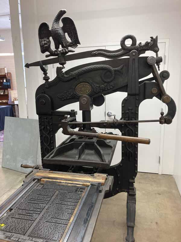 In 1989, Hoyem acquired the Mackenzie & Harris foundry and its historic typeface collection (the largest outside the Smithsonian), folding the operation into Arion’s workshop under the name M & H Type. Then in 2000, an umbrella nonprofit organization called the Grabhorn Institute was established to help maintain and fund Arion’s bookmaking facilities, educational programming, and apprenticeship program. After losing the lease to its original location during the dot-com boom, this mini empire devoted to traditional bookmaking moved to its current location in the Presidio in 2001.