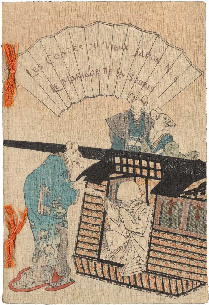 Chirimen books joined together Eastern and Western cultural traditions—on the page and through the cross-cultural collaborations that brought them into existence. As much as they may have helped Japanese language learners or been read as children’s stories, they also shed light on details of Japanese culture that would have previously been largely unknown in the West. In The Wonderful Tea-Kettle, for example, readers gain a glimpse of chanoyu, a traditional Japanese tea drinking ceremony. The Mouse’s Wedding, another fairy tale book on view, is a story about elegant mice that nonetheless accurately documents Japanese wedding and marriage conventions at the time.