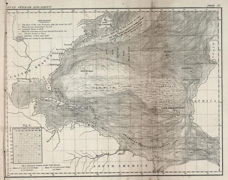 One oceanographer that it is known to have influenced was none other than Matthew Fontaine Maury. In his Physical Geography of the Sea, Maury became the first to note the Gulf Stream’s complete circulation around the Atlantic, and effectively drew to a close the project Franklin had initiated eighty-seven years earlier. In doing so, Maury credited Franklin for his mapping ingenuity, noting his course for the Gulf Stream “has been retained and quoted on the charts for navigation … until the present day [i.e., 1855].” The Franklin-Folger chart was indeed a uniquely wonderful contribution to ocean science.
