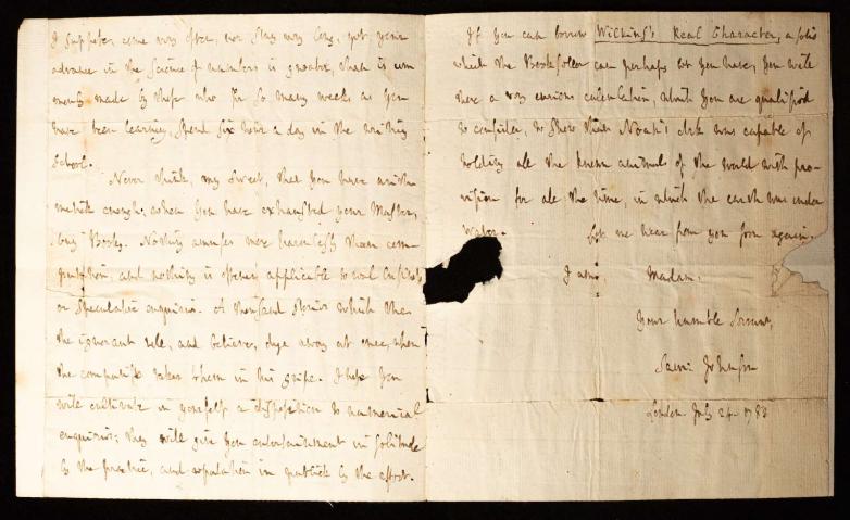"One of the cupboards in the library yielded several manuscript volumes detailing the household expenditure during the late 18th and 19th centuries. There were also fascinating diaries, accounts of society gossip, family feuds about inheritance, as well as advice on etiquette, marriage, and grumbles about failing health. I then came across a volume of over 100 letters that the family weren’t aware of and I asked if I could take them away to go through. Later, alongside a manuscript specialist we examined everything in more depth and it wasn’t long before our curiosity was piqued by the mention of Sarah Siddons, Hester Thrale-Piozzi, several members of the Hoare banking family and Samuel Johnson. Finally, a letter from and signed by, the famous Dr Johnson appeared towards the end of the volume."
