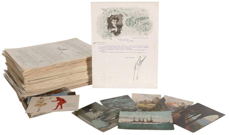 Leading the sale is lot 135, an archive of correspondence between Germain (born Charles Mattmueller, 1878–1959) and his assistant, student, successor, and friend, Paul Fleming. This gathering of typed and autograph signed letters, postcards, and other written materials is estimated at $30,000-60,000 and covers the period from 1908 to 1959. The collection was carefully assembled by Jay over decades.